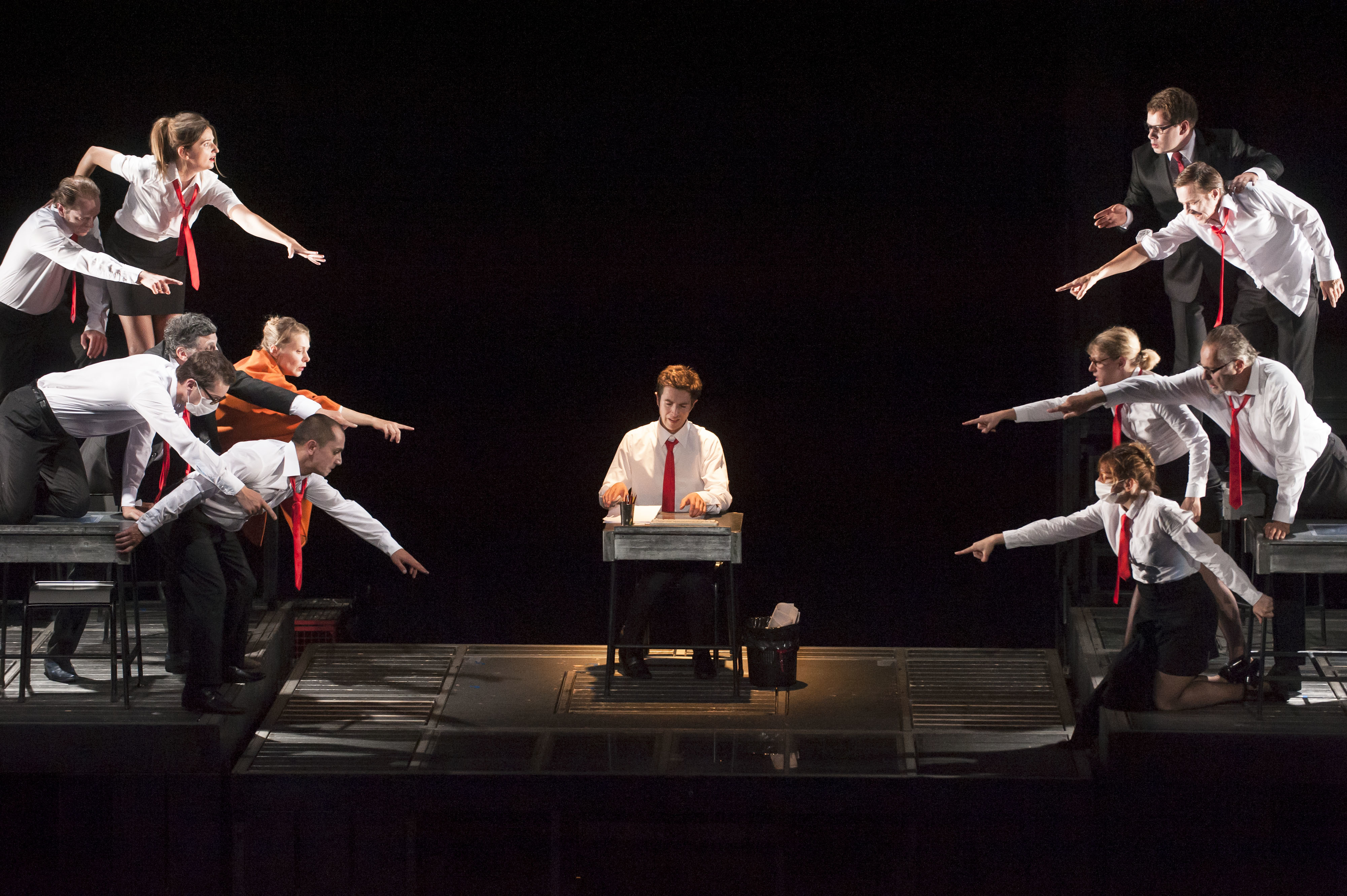 October 3, 2012 – Brooklyn, NY : The cast, including Jauris Casanova, center, performs in a technical rehearsal of the Theatre de la Ville’s production of French-Romanian playwright Eugene Ionesco’s 1959 play ‘Rhinoceros’ at BAM in Brooklyn on Wednesday night. The traveling production will perform from Oct. 4-6, 2012. *** Local Caption *** Acteurs, actrices, comediens, comediennes