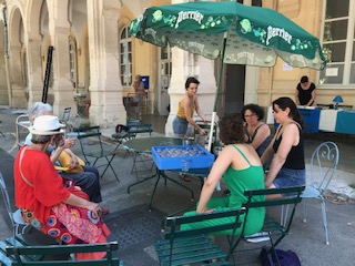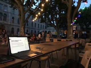 Je prends mes quartiers au lycée Saint-Joseph, au coeur des remparts. J’ai rejoint cette année le Centre de Jeunes et de Séjours au Festival d’Avignon, le CDJSFA pour les intimes. Une association qui a pour objet de donner à des jeunes, adultes ou famille la possibilité de découvrir le festival d’Avignon, à travers un programme d’échanges, d’ateliers, de rencontres. Nous sommes 16 festivaliers, venus des 4 coins de France, chevronnés en théâtre et très grands connaisseurs du Festival qu’ils fréquentent pour certains depuis plus de 20 ans. Alors, à l’heure des repas pris dans la cour du lycée, sur des grandes tables en bois éclairées par des lampions (petit bonheur d’été), les anecdotes et souvenirs de spectacles mémorables sont légion. Et l’envie de découvrir les premiers spectacles démangent déjà. Rendez-vous demain 12h pour le feuilleton théâtral d’Olivier Py « Hamlet à l’impératif » au jardin Ceccano. Que le festival commence !