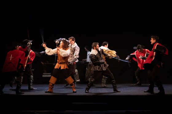Nous vous ferons grâce de l’intrigue dans cette adaptation qui reprend fidèlement le déroulé et la logique scénaristique de l’œuvre. Et on se concentrera à essayer de vous faire ressentir cette belle énergie qui coule tout au long de ce spectacle. C’est un « capes et d’épées » réjouissant qui se joue devant vos yeux, aux scènes de duel, efficaces, au rythme tonique et maîtrisé, aux riches lumières et costumes. Mais l’adaptation empreinte aussi avec intérêt à la modernité : son accompagnement musical aux teintes exotiques, ces scènes muettes dont on ne dévoilera rien de plus qu’elles accélèrent le temps sans rien perdre de la compréhension de ce qui se joue sous nos yeux. Et oui, ce « trois mousquetaires » est un spectacle tout public, tout âge et toutes générations qui raconte une histoire éternelle, une histoire d’hommes, et d’une certaine façon une histoire de la France. On repense à Bourvil et son Planchet, à Norbert Elias et sa magnifique description de l’histoire de notre pays dans la « Société de Cour », aux séances télévisuelles au coin du feu à Noël dans le cocon familial de nos 10 ans… Et si la madeleine de Proust fonctionne si bien, si le « fan service » comme l’appelle notre génération montante, n’élude en rien l’exigence théâtrale de ce spectacle, si le « Un pour tous …. » résonne à nouveau vibrant et définitif, on le doit au talent de l’ensemble des artistes qui nous offre ce très beau moment. Courez-y !