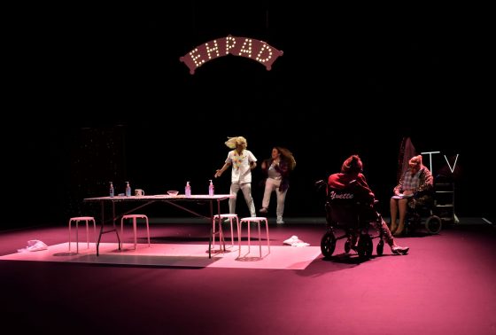 Cette comédie satirique haute en couleurs et en rythmes nous plonge au cœur d’un monde touchant et cruel inconnu de nombreux d’entre nous. Par le menu, elle nous décrit les réunions de staff mouvementées et les scènes de repas dantesques, les chorégraphies de fauteuils roulants et les lavages de mains au gel hydroalcoolique, les conditions de travail du personnel exécrables et les budgets alloués aux établissements minables… S’y démènent avec virtuosité Audrey Bertrand, Sophie Cusset, Robin Causse et Delphine Raoult tour-à-tour super héros du quotidien : cadres, aides-soignants, animateurs, résidents. Leurs répliques pulvérisent tous les tabous. Quant aux situations mises au devant de la scène sont autant inimaginables que criantes de réalisme.