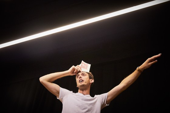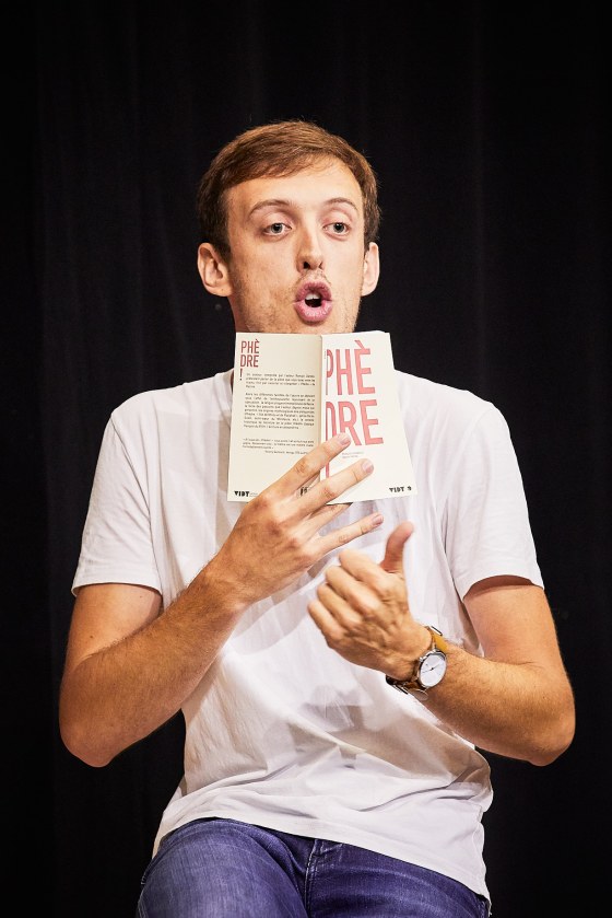 En bord de scène, il attend tranquillement que les spectateurs s’installent et finissent leurs conversations pour prendre place sur le plateau. Tee-shirt blanc, jean, baskets, le comédien Romain Daroles arbore un large sourire, petit livre en main : « Bonjour, je suis très heureux de vous accueillir, je m’appelle Romain Darolès. Toutefois, ce n’est pas chez les Romains que nous allons nous rendre ensemble, mais bien chez leurs collègues antiques, les Grecs. » Le ton est donné : candide, frais, décomplexé et profondément sympathique. Et notre comédien, amoureux transi de l’oeuvre racinienne, de nous embarquer 1 heure 40 durant dans l’histoire de la tragédie Phèdre, avant de finir par se glisser dans la peau des principaux personnages et d’en interpréter les plus beaux extraits.