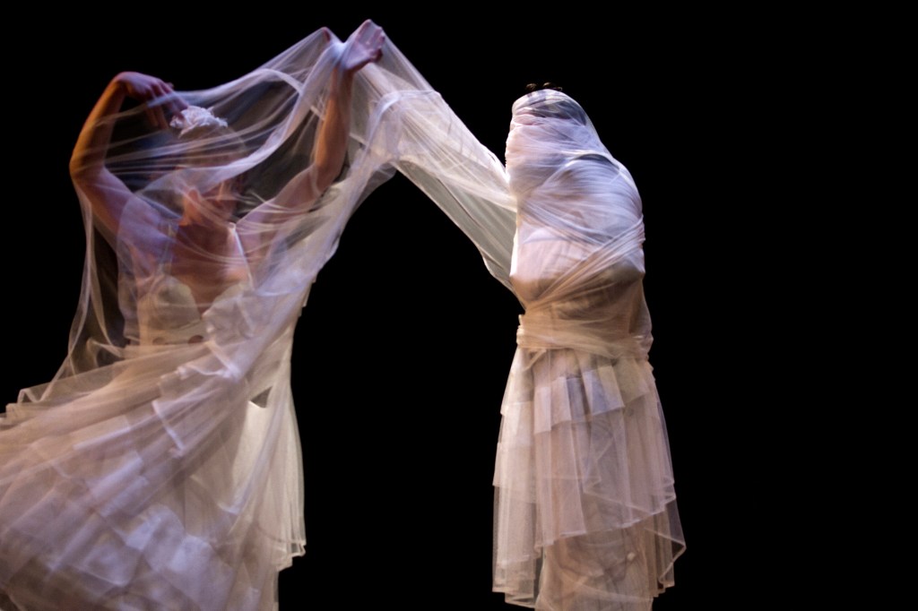 À l’instar d’un film de Kusturica, il y a de la musique (fanfare ou violoncelle), de la danse, du vin, des cris de joie ou de tristesse, des émotions toujours intenses. Pendant une heure trente, les artistes, tous multidisciplinaires, nous entraînent dans une sarabande effrénée pleine de sensualité où les robes des filles tournoient, les corps glissent sur le sol comme des pantins et la traîne d’une mariée se déroule indéfiniment. On y croise une truie qui défile sagement et un marabout qui se livre à une danse majestueuse.
