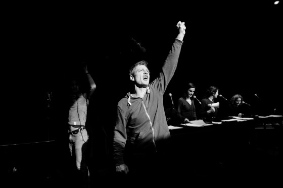 Il faut souligner le dispositif scénique original qui consiste à adapter la BD de Fabcaro (ou Fabrice Caro) sous forme d’une émission radiophonique avec moult bruitages et des morceaux de musique rock, qui font appel à notre imagination. Les séquences s’enchaînent très vite, passant du coq à l’âne, et on est emportés par la fougue des comédiens, complètement immergés dans la fiction.