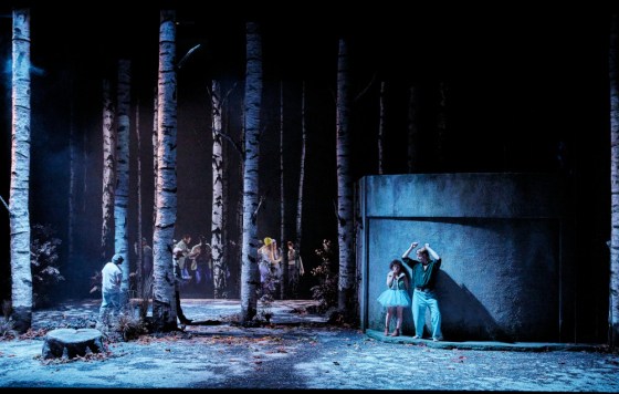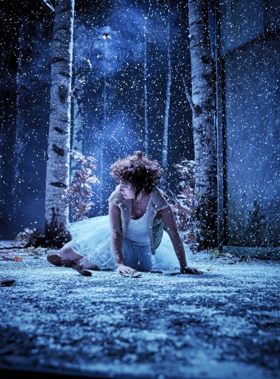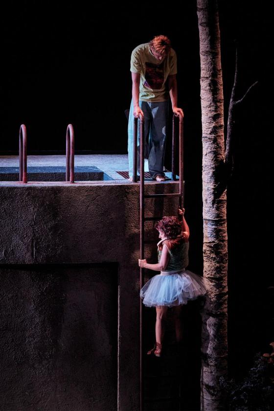 Face à elle, sa mère, working girl aux stilettos assumés et emprisonnée dans sa vie de couple, se sent vieillir et peine à trouver les mots et la bonne attitude avec sa fille. Ainsi, Pauline Bureau questionne la difficulté de grandir, de s’assumer et de trouver sa place, la difficulté d’être parent également et de perdre le contrôle de son autorité. Récit autobiographique certainement, à lire les interviews de Pauline Bureau, qui a puisé son inspiration dans son propre parcours de vie. Sujet éminemment séduisant. Et pour autant, le spectacle ne parvient pas à nous convaincre : les scènes, très courtes, ne nous laissent pas le temps d’entrer en profondeur dans la psychologie des personnages et nous donnent une impression de grande superficialité, là où le récit mériterait progressivement de s’épaissir. La direction d’acteurs, réussie, ne parvient pas à compenser l’écriture caricaturale de certains personnages (le langage des adolescents, la mièvrerie du père), l’improbabilité de certaines situations (la rencontre de la mère et de l’ermite dans la forêt) ou la répétition des effets de mise en scène (baignades dans la citerne). On retiendra la magnifique scénographie du spectacle qui transporte les spectateurs au coeur d’une forêt imaginaire, à la fois sombre et envoûtante, et la bande-son d’un spectacle « ultra moderne solitude ».