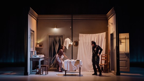 Si la mise en scène de Lilo Baur reste sobre et fidèle à l’esprit du film de Scola (notamment au niveau du décor et jusqu’à la robe portée par Laetitia Casta), la scénographie de Bruno de Lavenère apporte une touche de modernité au travers des projections vidéo qui évoquent le monde de l’extérieur avec le brouhaha du défilé et sa foule de spectateurs. À l’opposé, l’intérieur de l’appartement à l’atmosphère feutrée permet de mieux circonscrire la rencontre de ces deux êtres opposés idéologiquement, mais qui peu à peu, vont se découvrir et aller l’un vers l’autre. Ce sera l’occasion d’une prise de conscience pour Antonietta, femme inculte et pétrie des discours fascisants de son mari (et de l’époque). Les panneaux qui coulissent pour passer d’un décor à un autre et les jeux de lumière (Laurent Castaingt) apportent un peu de dynamisme à ce huis clos, seulement troublé par les apparitions impromptues de la gardienne de l’immeuble, fasciste convaincue et chienne de garde du régime.