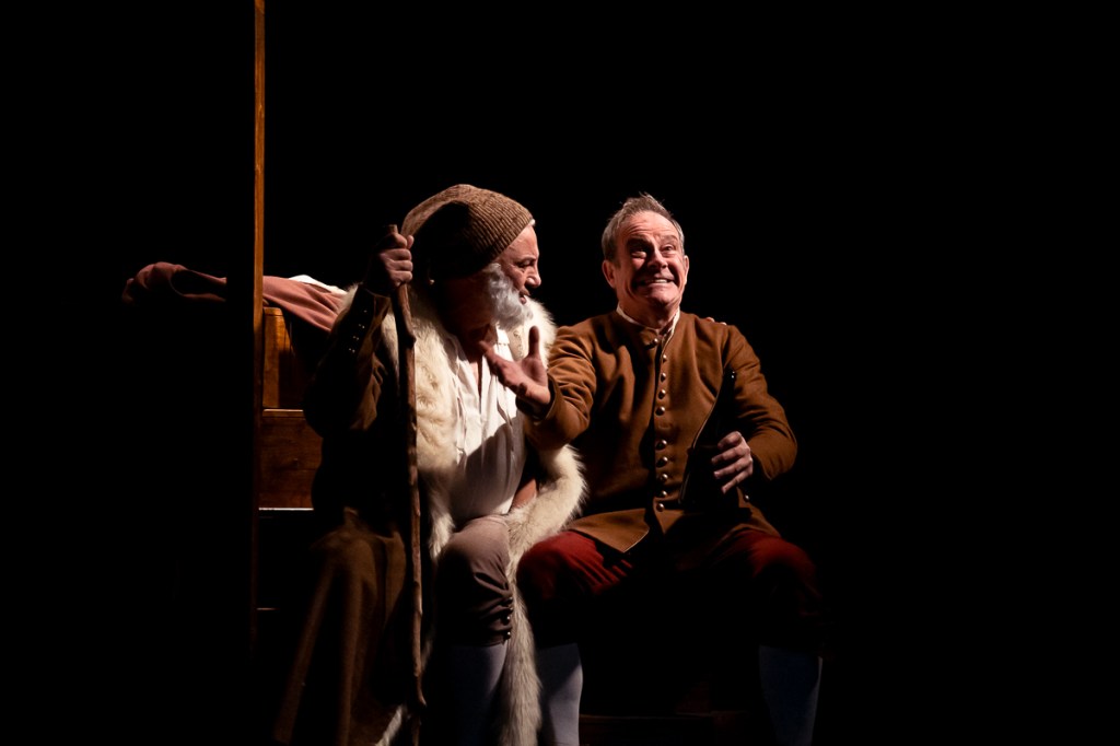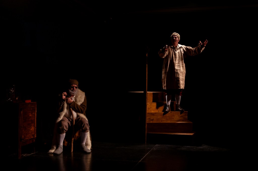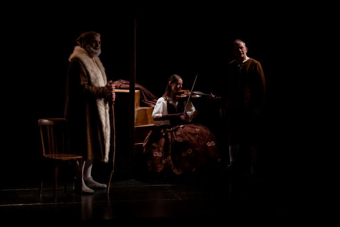 Si les détails de la mise en scène d’Elsa Saladin sont soignés (lumières en clair-obscur, musique live au violon d’Isabella Leonarda, contemporaine du peintre…), nous avons ressenti peu d’émotion lors des échanges d’Harmen, le père (Éric Belkheir ) et de Rembrandt, le fils (Christophe Delessart) autour des cheminements artistiques, des épreuves de la vie, des difficultés logistiques et financières. Malgré la poésie du texte, l’interprétation manque de nuances dans le ton et le rythme. Et puis, pourquoi avoir choisi de donner une voix musicale (Consuelo Lepauw au violon) aux deux amours du maître Saskia et Henrike ? Si Barbara Lecompte leur avait donné corps et des répliques, le dialogue père/fils aurait été entrecoupé, son écoute plus aisée, son rythme modifié. Et puisque Rembrandt parle peinture, technique et de la genèse de ses œuvres, pourquoi ne pas donner à les voir au public ?