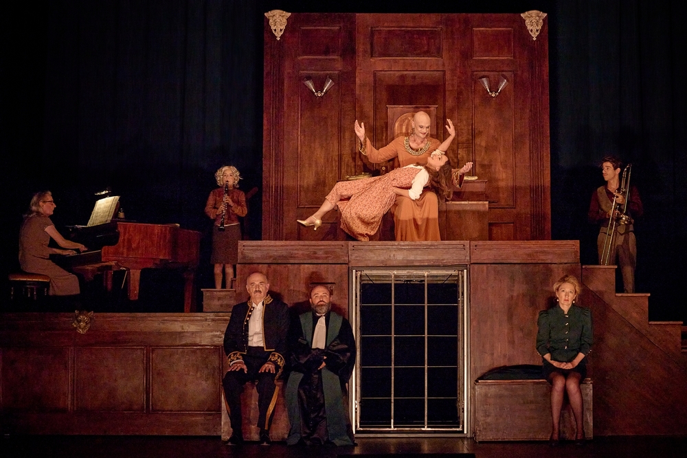 Mais n’oublions pas que cette pièce est avant tout une farce avec des personnages hauts en couleur, destinée à nous faire rire, surtout quand Émeline Bayart y apporte sa touche personnelle, avec des saynètes chantées notamment. Cette manière de traiter le sujet façon comédie musicale lui apporte une légèreté et une originalité bienvenues (La metteuse en scène, comédienne et chanteuse l’avait déjà fait avec succès dans la pièce de Feydeau, On purge Bébé !). L’excellente idée de faire jouer la présidente du tribunal et son assesseure par des hommes (Laurent Ménoret et Marc-Henri Lamande, pianiste) accentue le côté grotesque de ce tribunal d’opérette. Tous les comédiens et chanteurs sont excellents – même si certains moins à l’aise dans ce dernier registre. Saluons l’inénarrable Christophe Canard, en avocat castré prêt à tout pour sauver sa peau, et Herrade von Meier (la nouvelle bonne) et ses grands yeux de biche, parfaite en fausse ingénue qui prête volontiers son concours à son patron « agresseur ».