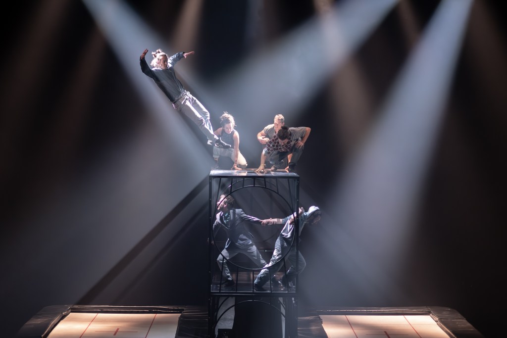 Face à eux, un vertigineux mur en plexiglas sur lequel ils vont s’élancer grâce à deux trampolines situés de part et d’autre. Ce mur, qui paraît infranchissable, ils vont pourtant l’affronter, l’arpenter seuls, en duo ou en groupe, essayant de le dépasser sans relâche. La musique rock envoûtante de Matthieu Tomi scande ce ballet incessant. Est-ce eux-mêmes ou les autres qu’ils défient ? Peu importe, la scénographie laisse libre cours à l’imaginaire. Les six artistes – une femme et cinq hommes – sont époustouflants de virtuosité, gracieux et légers comme des danseurs, leurs sauts d’une précision millimétrée. Les trampolines deviennent un espace de jeu où ils se croisent, se défient et rebondissent dans un chassé-croisé hallucinant.