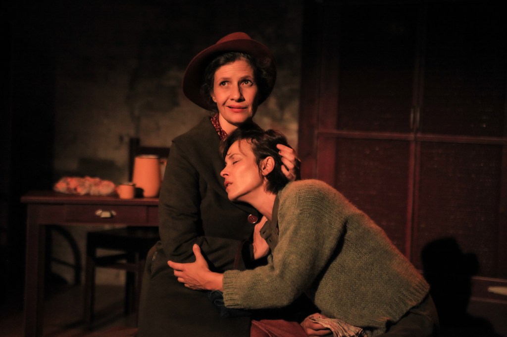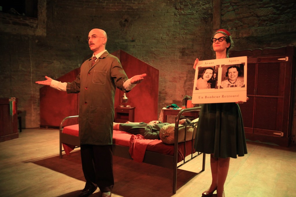 Je m’appelle Adèle Bloom nous permet de pénétrer à l’intérieur des murs d’un hôpital psychiatrique canadien de la fin des années 1940. On découvre le quotidien des patients, les relations soignants/soignés, les liens avec les familles, le non-respect du secret médical… et les traitements expérimentaux subis par les patients sans que jamais leur soit demandé leur propre accord même s’ils ont atteint leur majorité. Seul celui de leur famille est sollicité. Le tout est édifiant, dérangeant, percutant, instructif. Bouleversant. Quant à l’interprétation d’Armelle Deutsch, elle est intense et impressionnante de vérité et de grandeur. Magnifique. Laura Elko et sa marionnette habitent étonnamment tout le spectacle malgré leur silence quasi-permanent. À elle seule, Sophie-Anne Lecesne interprète quatre personnages : la mère, Poppie et deux infirmières-chef. En un instant et un changement de costume (trop minimaliste, parfois on doute de qui elle est aux premières secondes de sa nouvelle apparition, ses costumes étant tous du même coloris, vert olive), elle est incroyable de justesse dans le ton comme dans le geste. Pour finir, Philippe d’Avilla est terrifiant par son charisme et son discours inébranlable autour de ses certitudes médicales totalement erronées, exprimé sur un ton froid et avec un regard cinglant. En somme, une distribution de très haut vol, au service d’un texte qui aurait mérité de se défaire de bien des longueurs dans la première partie, qui freinent la progression vers la folie d’Adèle Bloom. Heureusement, le décor, la lumière, la musique de Chopin (parfois trop forte si bien qu’elle couvre la voix des comédiens) et la mise en scène de l’auteur habillent avec justesse et précision la descente aux tréfonds de ces âmes humaines complexes.