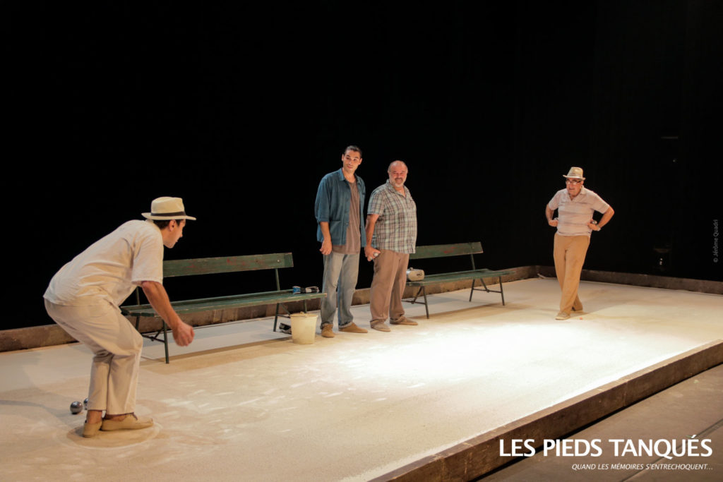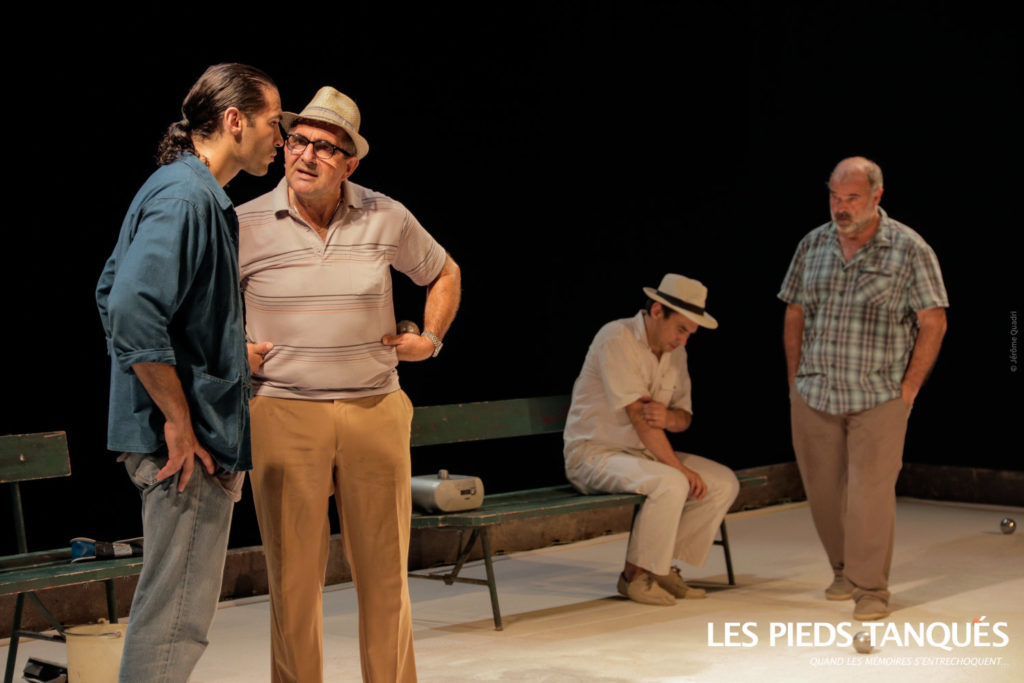 Voilà un vrai succès populaire comme Coup de Théâtre les apprécie ! Tout en suivant une partie de pétanque dans un vrai boulodrome pour décor où s’entrecroisent les bons mots et les accents, les rires et les sourires, on est captivé par les échanges des quatre joueurs autour de l’Algérie, la colonisation, la guerre, les rapatriés, les harkis… On écoute leurs histoires et leur interprétation de la grande Histoire telle qu’ils l’ont vécue avec leur cœur et leurs tripes : les blessures, les fêlures, les émotions… Les références sont nombreuses, elles posent les faits sans jamais prendre parti. Elles nous troublent, nous émeuvent comme ce quatuor de comédiens-joueurs de pétanque : Philippe Chuyen, Gérard Dubouche, Thierry Paul, Mourad Tahar Boussatha, attachants et époustouflants de vérité (en comédie comme en pétanque).