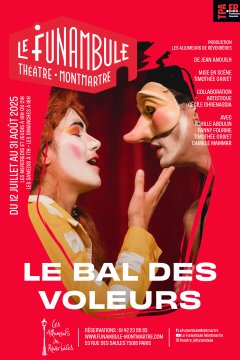 Cet été, Les Allumeurs de Réverbères ont échangé leurs tréteaux contre la scène du Théâtre des Funambules avec la pièce de Jean Anouilh, Le Bal des voleurs. L’adaptation complètement déjantée mais très poétique, proposée par Arthur Cachia et Timothée Grivet mêlant théâtre, danse et jeu masqué, nous a de nouveau ravis (la première fois à sa création voilà 2 ans) comme à l’ensemble des spectateurs, petits et grands. Aussi je renouvelle mes 4 cœurs sans hésitation.