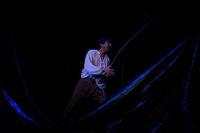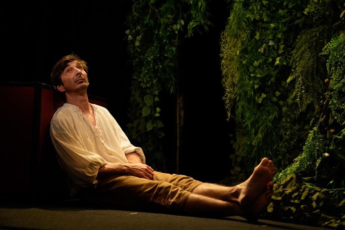 Quant à Erwan Creignou, seul en scène, il excelle, non, il est prodigieux, dans l’interprétation des deux personnages, Robinson et Will. Dès les premiers instants, on est avec Robinson dans son bateau en pleine tempête. Avec lui, on souque, on affale les voiles, on s’effraye… Puis c’est le naufrage, on se noie avec Robinson, on reprend son souffle avec lui sur le rivage, surpris d’être vivants (nous aussi !). Sur l’île, on est toujours avec lui : il hurle, il suffoque, il rit, il boit de la gnole, il tue un bouc, il organise sa survie, il se bat avec Will-Vendredi… Son expression corporelle est admirable, juste, remarquable. Son jeu est généreux. Le plus merveilleux des cadeaux qu’un comédien peut faire à son public.