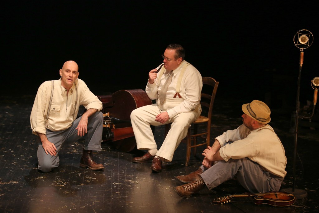 Entre musique et narration, langue américaine et française, la mise en scène de Xavier Simonin magnifie Les Raisins de la colère de John Steinbeck. Son interprétation d’une multitude de personnages est époustouflante de vérité, de sincérité, de justesse. Trois excellents musiciens – Claire Nivard, Stephen Harrison et Glenn Arzel ou Manu Bertrand – l’accompagnent vers ce nouvel horizon. Grâce aux mots et aux chants, chacun imagine les personnages rencontrés avec leurs émotions et leurs douleurs, les décors des paysages traversés et au bout du chemin, la terre d’exil dans leur propre pays avec les regrets et les doutes.