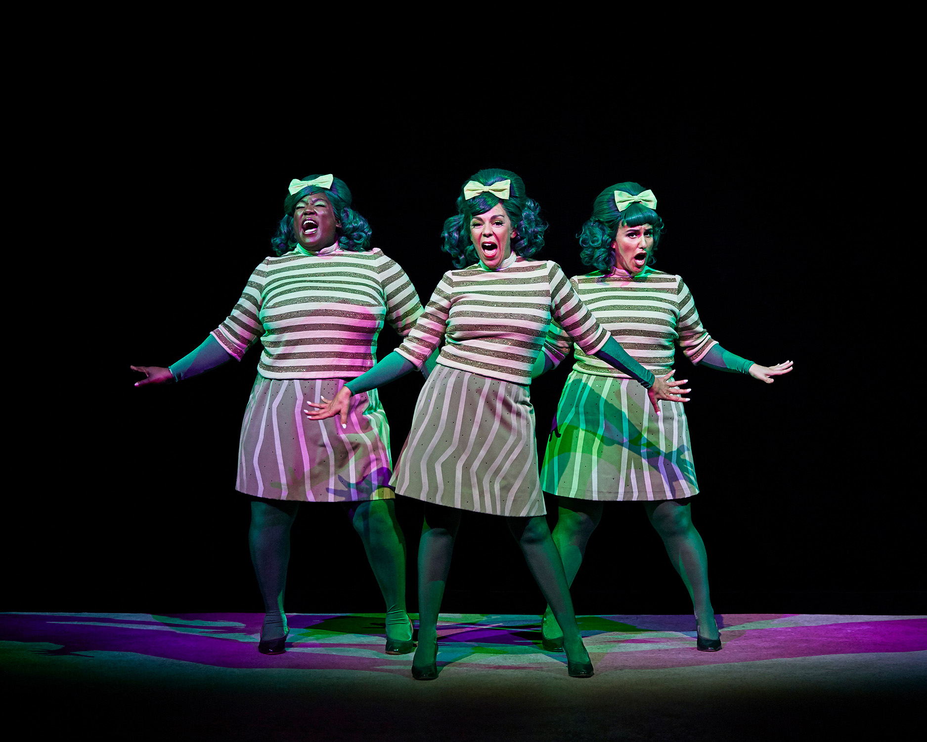On l’aura compris, le scénario improbable permet à Hecq/Lesort de pousser les curseurs du genre à fond et de surjouer tous les codes de la pop culture et du divertissement : un dosage bien senti entre kitsch, gore, faux suspense et personnages caricaturés à l’extrême et, disons-le, extrêmement drôles : la blonde ravissante idiote et malheureuse en amour (convaincante Judith Fa), le dentiste bad boy névrosé et bien porté sur la chose (excellent Arnaud Denissel), le patron fleuriste Monsieur Muschnik, gueulard à souhait (le brillant David Alexis, déjà applaudi dans la troupe des Misérables), entre autres. Le spectacle regorge de trouvailles scéniques et visuelles, à commencer par la représentation de la plante carnivore (joliment baptisée Audrey II !) qu’on voit grandir au fil de la pièce (vrai défi technique !) et interpeller, avec sa voix de crooner (eh oui !), son protecteur de Seymour pour réclamer à… manger ! Et même si l’intrigue tarde un peu à se mettre en place, on se laisse vite emporter par le crescendo des situations de plus en plus burlesques. Pour muscler l’ensemble, les metteurs en scène ont eu l’excellente idée de faire swinguer le spectacle par un girls band, façon Ronettes, de doo-wop et rhythm’n’blues, qui, avec leurs vibes et saynètes dansées irrésistibles, donnent un charme fou à l’ensemble.