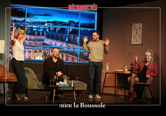Les comédiens (en alternance : Christine Anglio ou Camille Ludig, Laurie Marzougui ou Anaïs Yazit, Guillaume Mélanie ou Max Geller, Franck Olivier ou Gabriel Valadon), tous parfaitement à l’aise dans leurs baskets, nous entraînent dans leur délire. À signaler, quelques jolies trouvailles de mise en scène (Guillaume Mélanie, Gabriel Valandon) comme la séquence façon flash-back, très réussie.