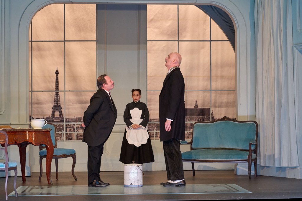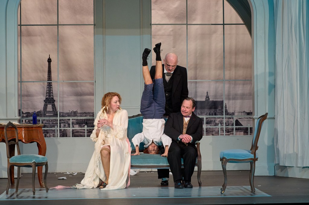 On purge bébé, vaudeville en un acte de Georges Feydeau représenté pour la première fois en 1910, est plein d’audaces dans la forme comme dans le fond (faire rire 1h30 autour de questions scolastique, il fallait être reconnu comme le génie du vaudeville pour oser). Avec ses divers rebondissements rythmant une matinée cauchemardesque chez une famille bourgeoise, cette comédie de mœurs relève de la farce par sa truculence. Personnage central : un garçonnet de 7 ans (Corinne Martin) au caractère bien trempé. Sa mère (Émeline Bayart) se promène non pas toute nue mais en tenue très négligée devant les siens comme devant ses invités sans gêne aucune. Quant aux autres personnages (Marc Chouppart, Manuel Le Lièvre ou Christophe Canard, Delphine Lacheteau, Vincent Arfa), ils sont hauts en couleurs. Les répliques de Feydeau sont si hilarantes qu’elles font immanquablement mouche. Les couplets chantés (accompagnés au piano en live par Manuel Peskine) piochés dans le répertoire burlesque de l’époque de Feydeau sont un ravissement : « Ces pépites chantées, placées à propos révèlent ainsi l’inconscient des personnages, inconscient qui se révèle délicieux, grinçant, parfois cruel mais jamais dénué d’humour poétique. » La mise en scène endiablée d’Émelyne Bayart, à la fois fantaisiste et débridée, nous emporte dans un frénétique tourbillon d’humour décapant.