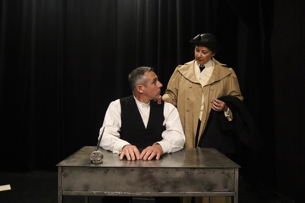 La sobre mise en scène d’Éric Cénat, dans un décor volontairement minimaliste, laisse place aux mots comme aux émotions. Au fil du triste déroulé des évènements, l’élégante tenue des jeunes mariés Dreyfus s’efface : le complet noir pour un caleçon et une chemise en toile de coton blanc, la robe longue de dentelle pour une robe noire à la coupe stricte. Joël Abadie, Lucile Chevalier et Claire Vidoni sont poignants de vérité dans cette bouleversante évocation de l’affaire Dreyfus, de sa dégradation à sa réhabilitation militaire.