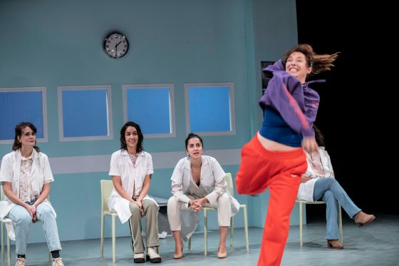 On retrouve avec plaisir cinq des comédiennes déjà présentes dans Barbe-Bleue (Valentine Bellone, Anne Knosp, Valentine Krasnochok, Nelly Latour et Jordane Soudre), plus une sixième, Fernanda Barth, toutes très investies dans leurs personnages. Elles sont bluffantes de naturel, jouant tour à tour les soignantes ou les patientes. La cocasserie de certains rôles – quand elles interprètent un papier peint, un arbre, voire une pomme pourrie ! – déclenche le rire tout en libérant la tension liée à la gravité des cas exposés.