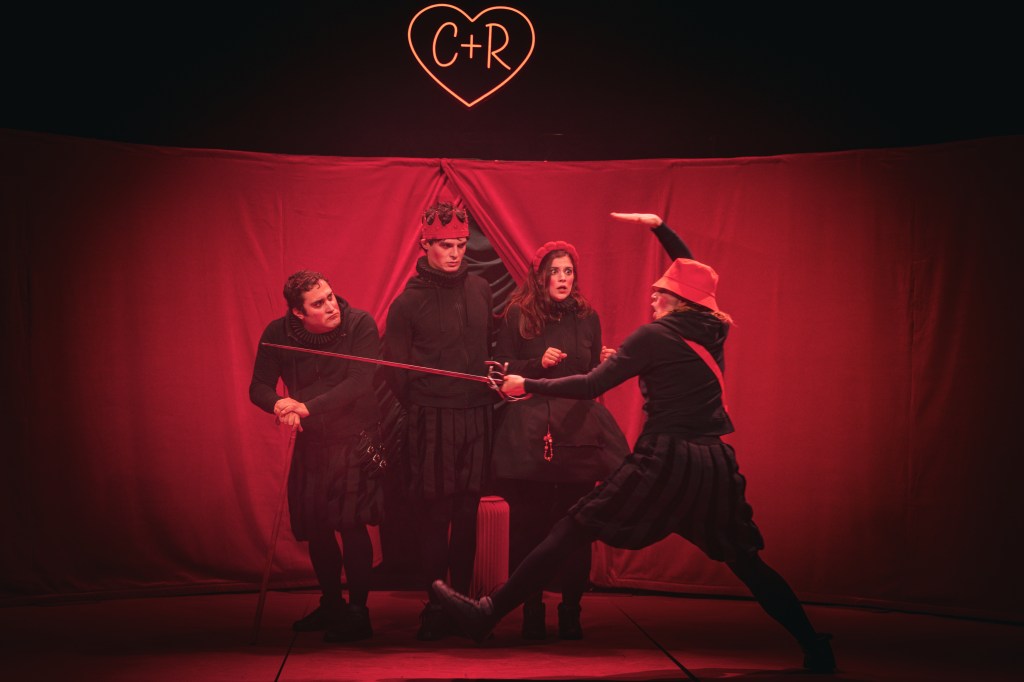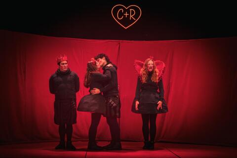 Voilà comment l’autrice – metteuse en scène Caroline Vigneaux explique la genèse de son projet et sa conception originale de ce must du théâtre français. Pour se faire, de jeunes comédiens – Marie Bucher, Marion De Schrooder, Albin Duvert, Florian Schwob – très investis pour l’interprétation d’une multitude de personnages par eux quatre. Pour agrémenter leur jeu, des dialogues en alexandrins truffés de persiflage et de références contemporaines afin que l’intrigue soit accessible à tous. Des chorégraphies originales et des slams de Mc Solaar emballent le tout avec brio. Les décors et les costumes s’habillent de rouge, de noir et d’ironie.
