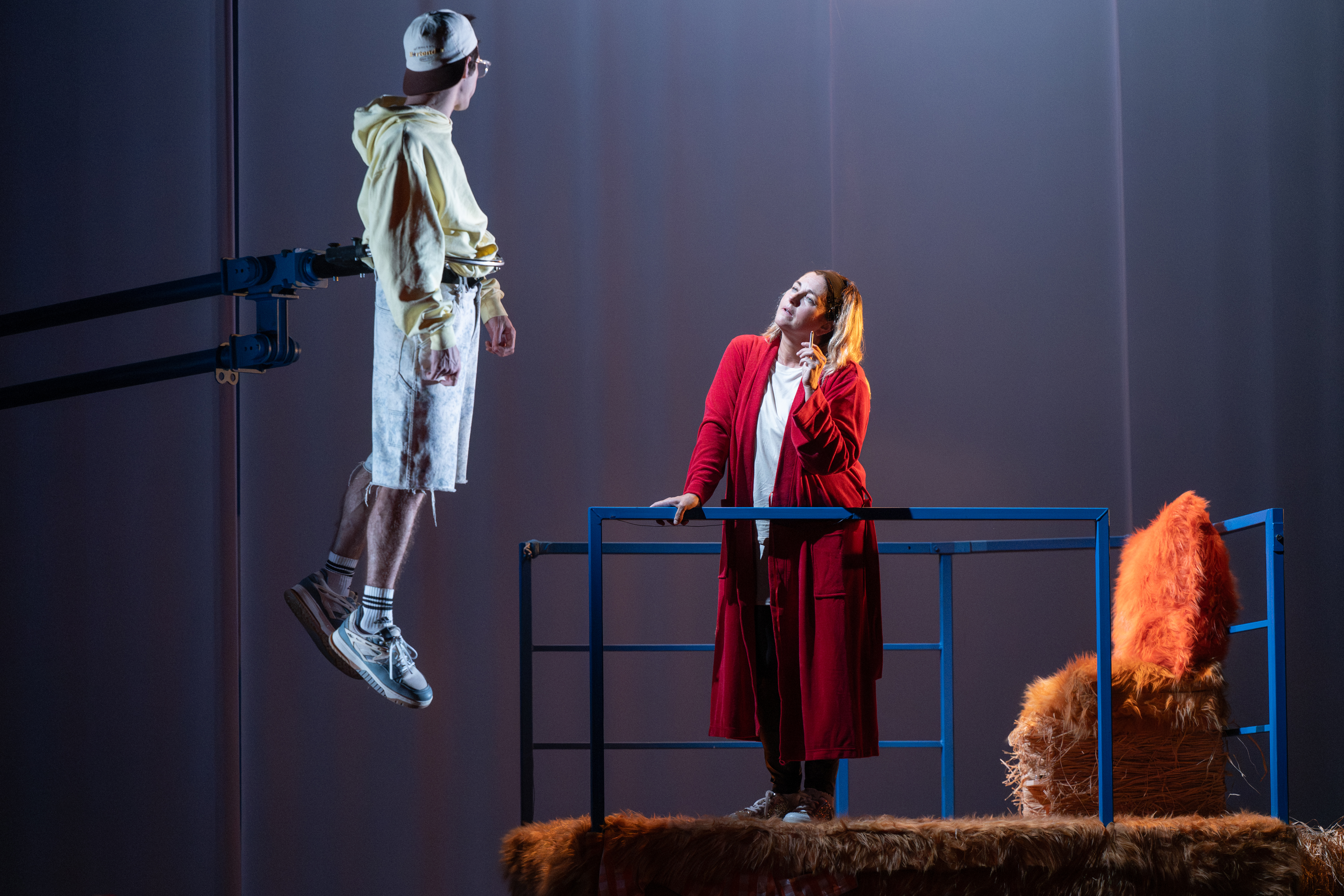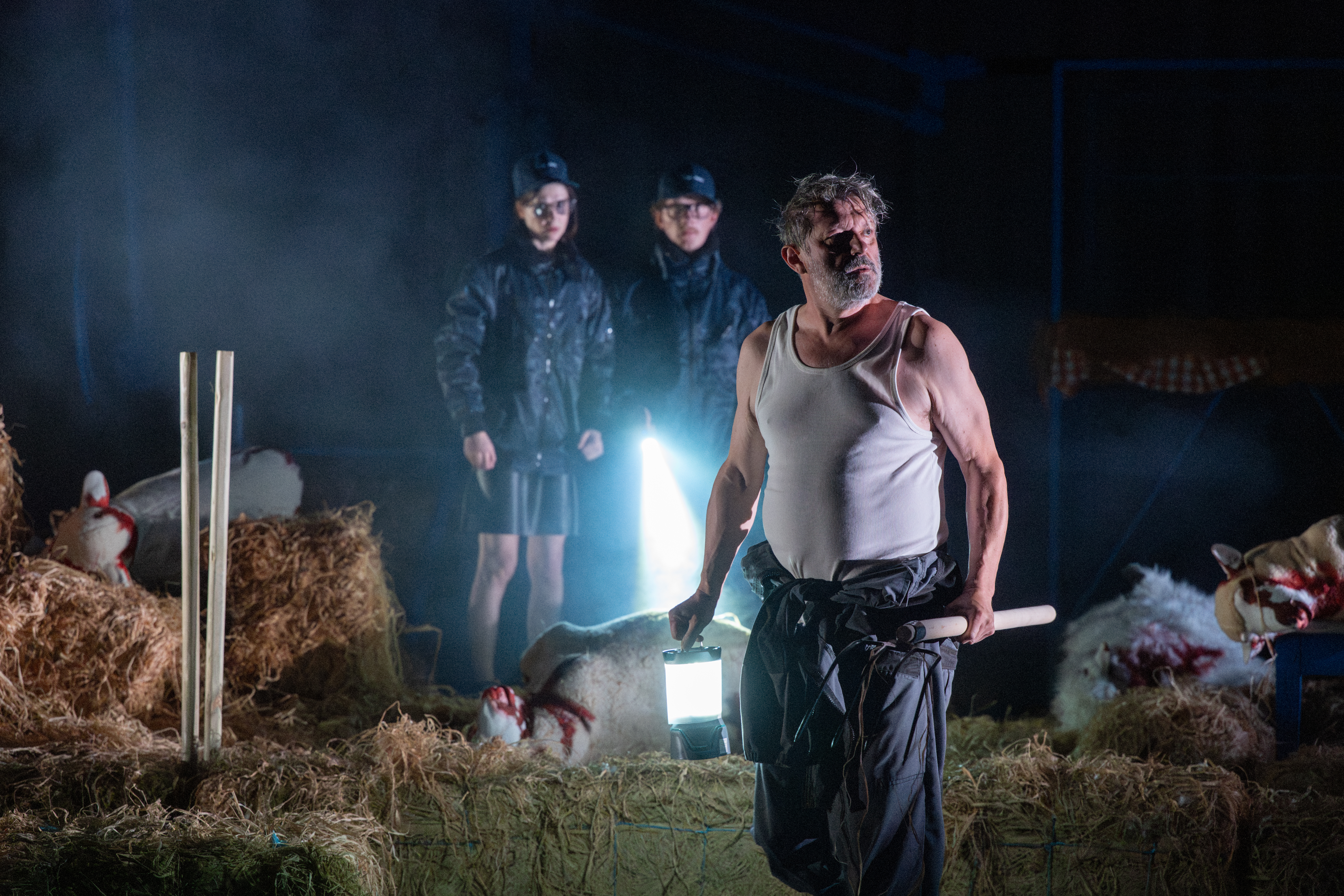 Foutue Bergerie, c’est d’abord une histoire un peu loufoque d’une famille d’exploitants agricoles, endeuillée par le suicide d’Étienne (Simon Jacquard), l’un de leur fils, traumatisé par son micro-pénis, dû aux pesticides ingérés par sa mère pendant la grossesse. Lucas, son frère, (Kevin Perrot) n’a désormais qu’une trouille, c’est de subir le même sort et s’emploie à prouver le contraire en honorant à qui mieux mieux sa petite amie pas farouche (Mathilde Le Borgne) dans les bottes de foin. Le ton est donné. Pendant que la mère (Cristiana Reali) peine à se remettre de ce drame, le père (Marc Bodnar), tendance extrême droite, s’emploie, nu comme un ver, à clôturer son champ des agressions extérieures. Avant que sa rencontre avec Jamel (Yanis Chikhaoui), un jeune de la cité voisine, ne vienne remettre en cause ses convictions et peut-être davantage. Ajoutez à cela une journaliste aux dents longues (Anna Fournier) qui vient enquêter sur le groupe pétrochimique et deux policiers pas très futès, en charge de l’attaque de pittbuls sur les brebis de l’exploitation. Et pendant que les humains se démènent avec leurs problèmes existentiels, les animaux, eux, ils causent….