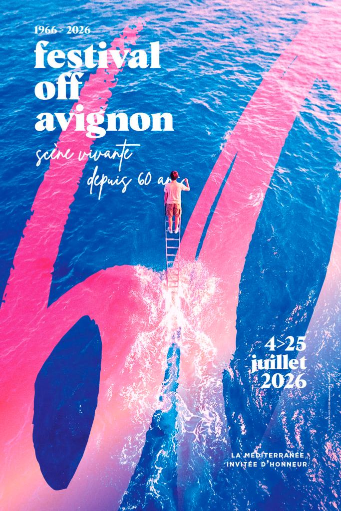 L’affiche 2026, réalisée par le graphiste avignonnais Jérôme Cosh, représente « un geste fragile, tendu vers l’infini, là où l’élan individuel devient une force collective. Le festival Off Avignon s’y affirme comme un espace d’équilibre instable, où créer implique toujours de risquer. À 60 ans, il ne célèbre pas le passé : il continue d’ouvrir l’horizon. » En fond, la mer Méditerranée, l’invitée d’honneur.