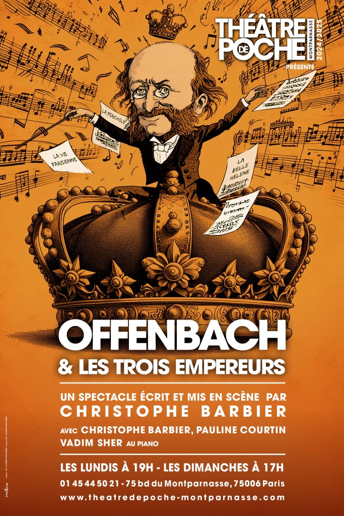 ♥♥♥♥ « Dans le vestibule du fameux restaurant La Tour d’Argent est, encore aujourd’hui, affiché un menu célèbre : celui du fastueux dîner qui rassembla trois empereurs, le 7 juin 1867, autour de la table du Café anglais, dans le salon appelé Le Grand Seize. Huit heures de festin raffiné qui marquèrent les esprits de l’époque. Ces têtes couronnées étaient venues à Paris pour visiter l’Exposition universelle, et elles avaient toutes assisté à une représentation de La Grande Duchesse de Gérolstein, le dernier opéra-bouffe de Jacques Offenbach, qui triomphait et consacrait la gloire de la cantatrice Hortense Schneider. Et si le compositeur et son interprète avaient assisté à ce dîner ? Mieux : et si les trois empereurs leur avaient commandé un spectacle pour égayer le dîner, un spectacle composé des plus beaux airs de la carrière d’Offenbach ? » (Christophe Barbier, auteur et metteur en scène).