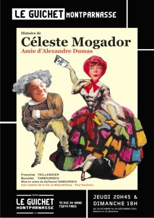 La collaboration littéraire – authentique – entre Dumas et Mogador est le pivot de ce spectacle. Si tous les faits qui y sont relatés sont véridiques, le dialogue des deux protagonistes est imaginaire. Céleste Mogador, indomptable et ambitieuse, nous embarque dans sa vie pleine de rebondissements pour la plus grande joie d’un Alexandre Dumas (supposé) en mal d’inspiration.