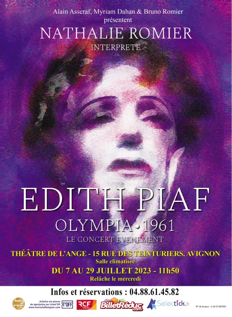 ♥♥♥ Nathalie Romier, considérée comme l’une des meilleures interprètes du répertoire de La Môme, reconstitue le dernier concert mythique d’Édith Piaf. Renouant avec le même univers visuel et les mêmes chansons, dans le même ordre de passage, le spectacle est la réplique du récital qu’Édith Piaf délivra à son public en 1961 à l’Olympia.