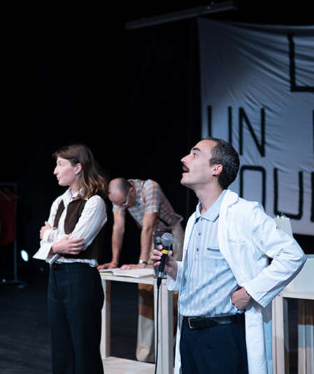 On fabrique, on vend, on se paie (création collective d’après le livre de Charles Piaget, Syllepse Eds), raconte l’histoire de six ouvriers et ouvrières qui se mettent en lutte pour préserver leur travail et qui découvrent en chemin la solidarité, la force du collectif, le féminisme, l’insoumission. Le spectacle se structure autour de trois temps forts d’assemblées générales. Néons dans la salle et personnages dans le public, les spectateurs viennent gonfler les rangs de la lutte, comme des ouvriers ou sympathisants présents dans le mouvement. Ils et elles votent, chantent, applaudissent. À la seule force du collectif, ils luttent ensemble pour leur avenir. Au fil du mouvement, des changements de mentalité apparaissent au sein du collectif en lutte telle la place des femmes dans le mouvement.
