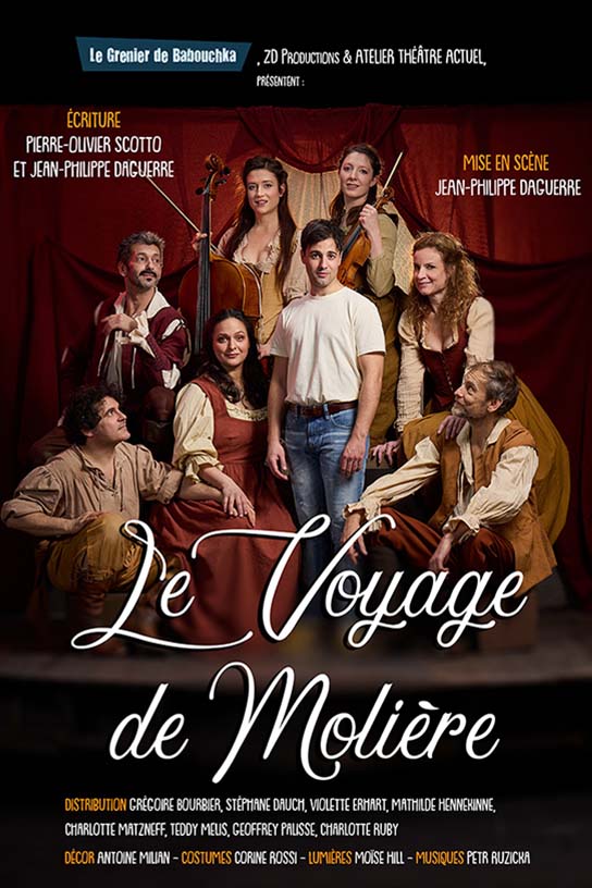 Le Voyage de Molière est un joyeux et ludique hommage à Jean-Baptiste Poquelin et au théâtre imaginé par Pierre-Olivier Scotto et Jean-Philippe Daguerre, mêlant adroitement syntaxe contemporaine et phrases originales tirées des œuvres de Molière. C’est un divertissement instructif, truculent dans sa mise en scène orchestrée par Jean-Philippe Daguerre, inventif dans le joli décor d’Antoine Milian, beau dans les costumes de Corinne Rossi. Surtout, il est animé par une magnifique troupe (Grégoire Bourbier, Stéphane Dauch, Violette Erhart, Mathilde Hennekinne, Charlotte Matzneff, Teddy Mélis, Geoffrey Palisse et Charlotte Ruby) dont Molière ne rougirait pas.