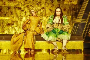 Michel Fau s’attaque au classique des classiques avec un parti pris scénographique et artistique qui séduira ou ne séduira pas mais ne laissera personne indifférent. « Il faut rêver le XVIIème siècle, profiter du style baroque de l’œuvre et exploiter l’alexandrin qui est le vers noble, pour mettre en lumière un monde décadent et raffiné, précieux et féroce » indique-t-il dans sa note de metteur en scène. Pari fort réussi de ce point de vue. Dès le lever du rideau, on est plongé dans une esthétique sophistiquée, saturée de couleurs, de rubans, de strass, un vrai « bling bling » Grand Siècle. Il faut noter le soin tout particulier apporté aux costumes, perruques et maquillages, tous plus superbes les uns que les autres et parfaitement sublimés par la lumière chaude et intimiste de Joël Fabing.