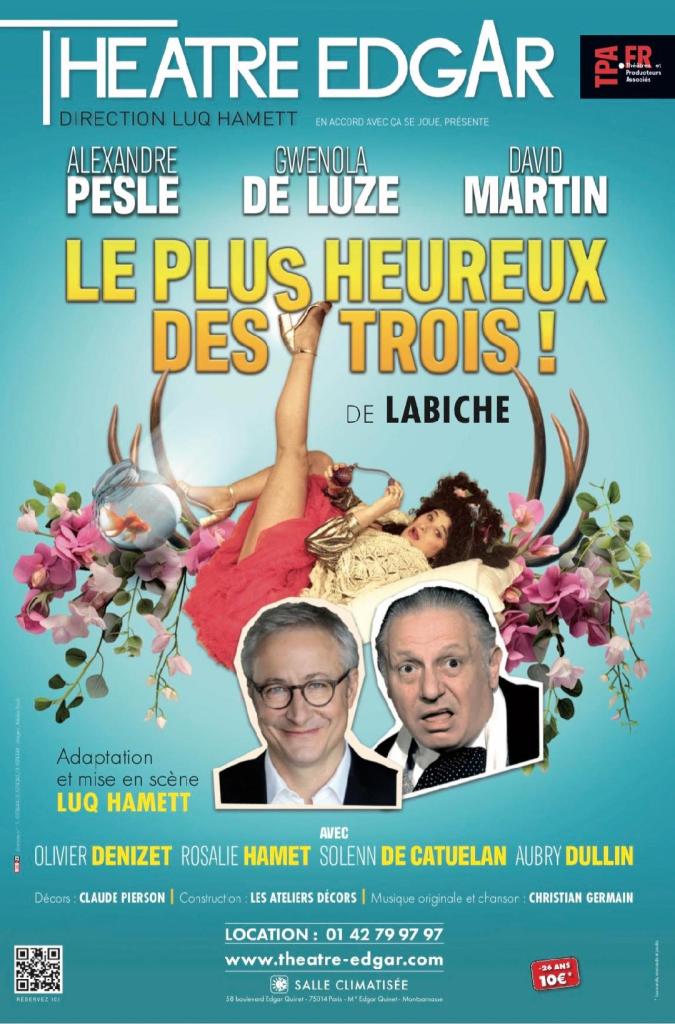 Le Plus Heureux des trois, d’Eugène Labiche et Edmond Gondinet, a été présenté pour la première fois au Théâtre du Palais-Royal (Paris, 1870). Adapté et mis en scène par Luq Hamett (directeur du Théâtre Edgar), ce vaudeville étourdissant est mené tambour battant pendant ses trois actes au cours desquels des situations farfelues s’enchaînent avec célérité.