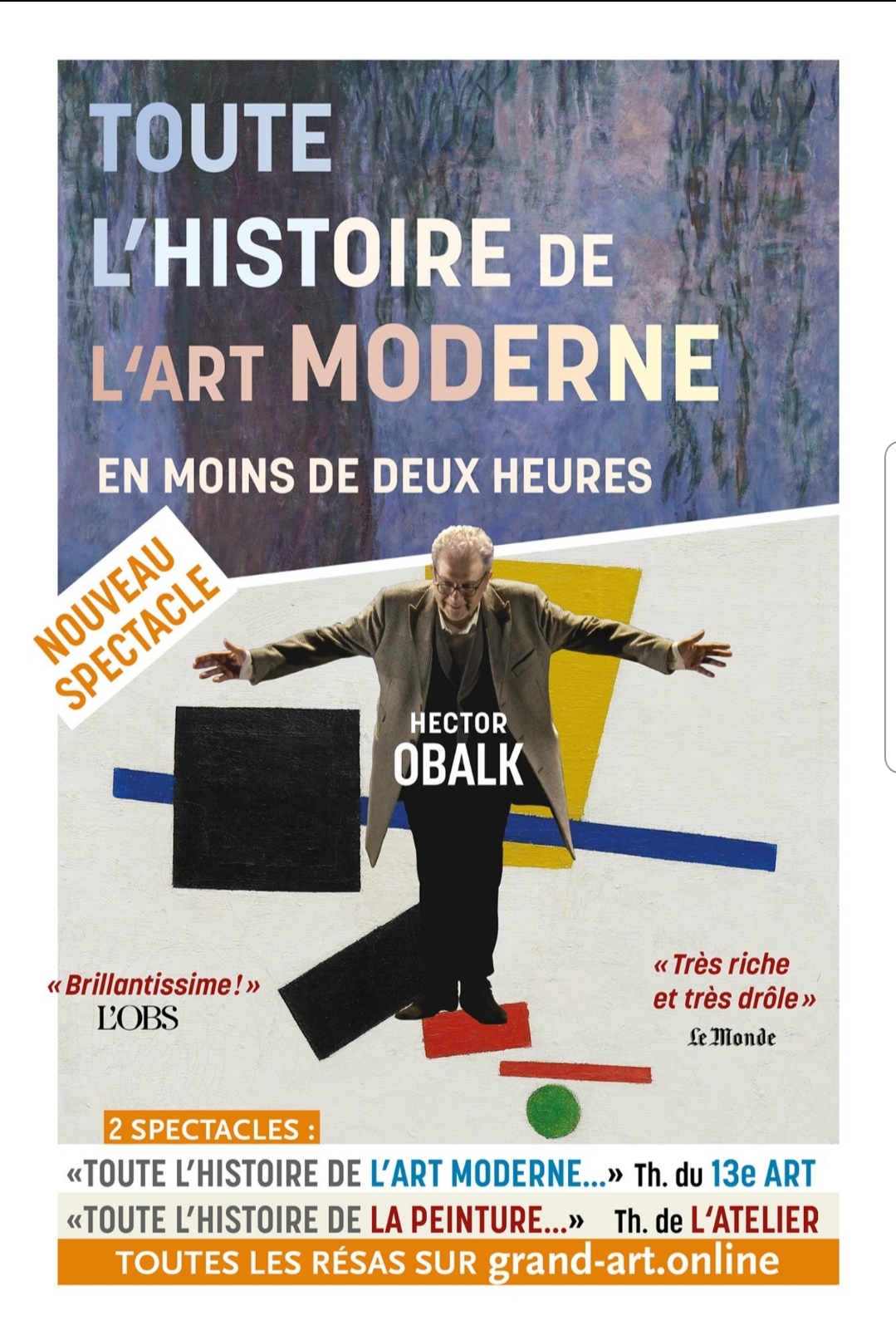 ♥♥♥♥ Dans ce nouvel opus proposé par Hector Obalk, on prend le même décor – un mur de 1000 tableaux (vertigineux), un habillage musical (magnifique) – deux musiciens (de vrais virtuoses) et un infographiste (tout aussi talentueux). Le critique d’art nous révèle quelques morceaux choisis de l’histoire de l’art moderne dans la peinture en moins de deux heures. En s’appuyant sur des œuvres représentatives de Picasso, Matis, Monet, Seurat, Dali, Kandinsky et de tant d’autres, il nous dévoile preuve à l’appui les petits secrets de leur génie artistique. Ainsi nous découvrons les particularités distinguant l’impressionnisme du nabis, des fauves, de l’expressionnisme, du symbolisme, du surréalisme, du cubisme, des abstractions et des antimodernes.